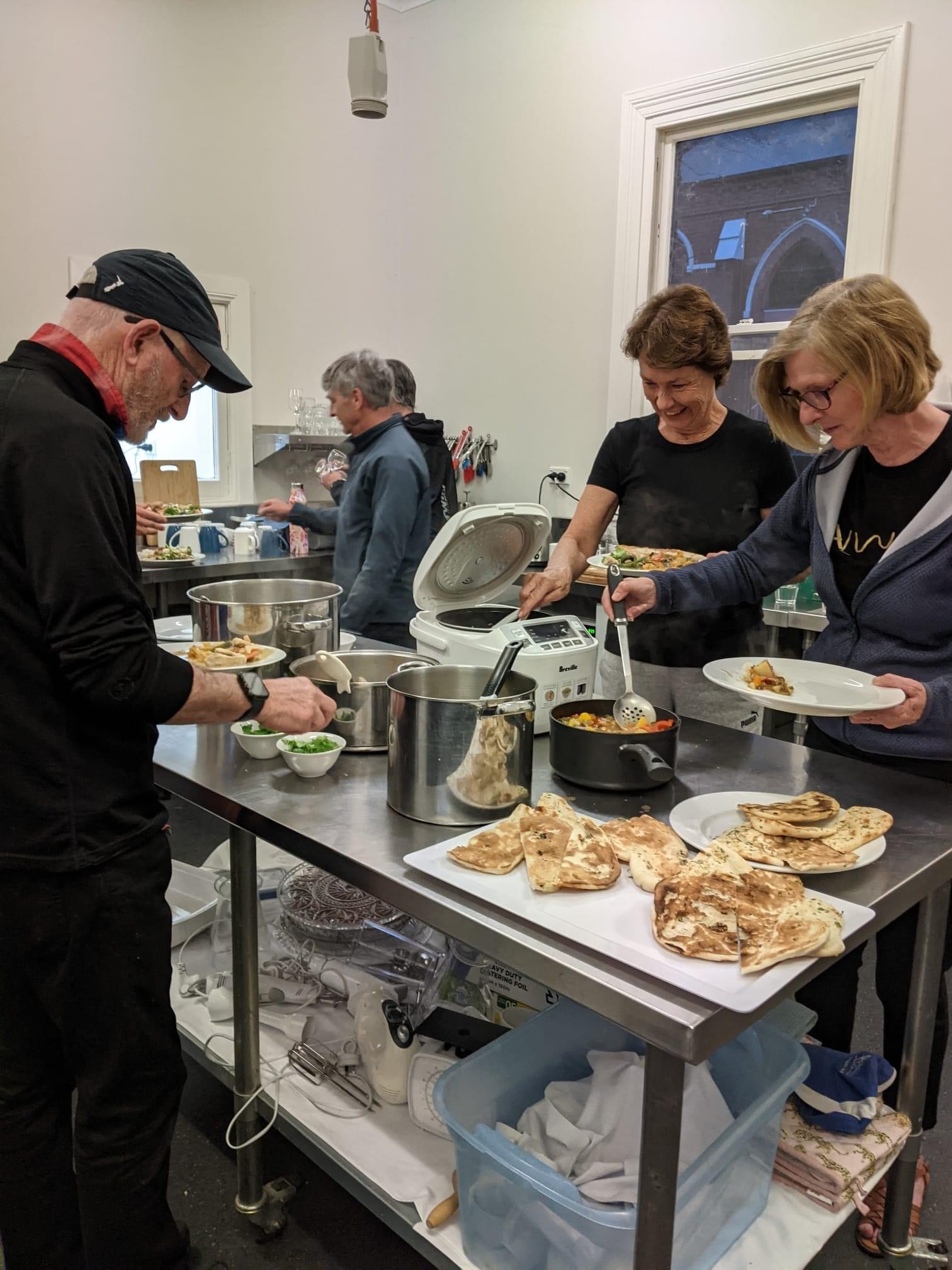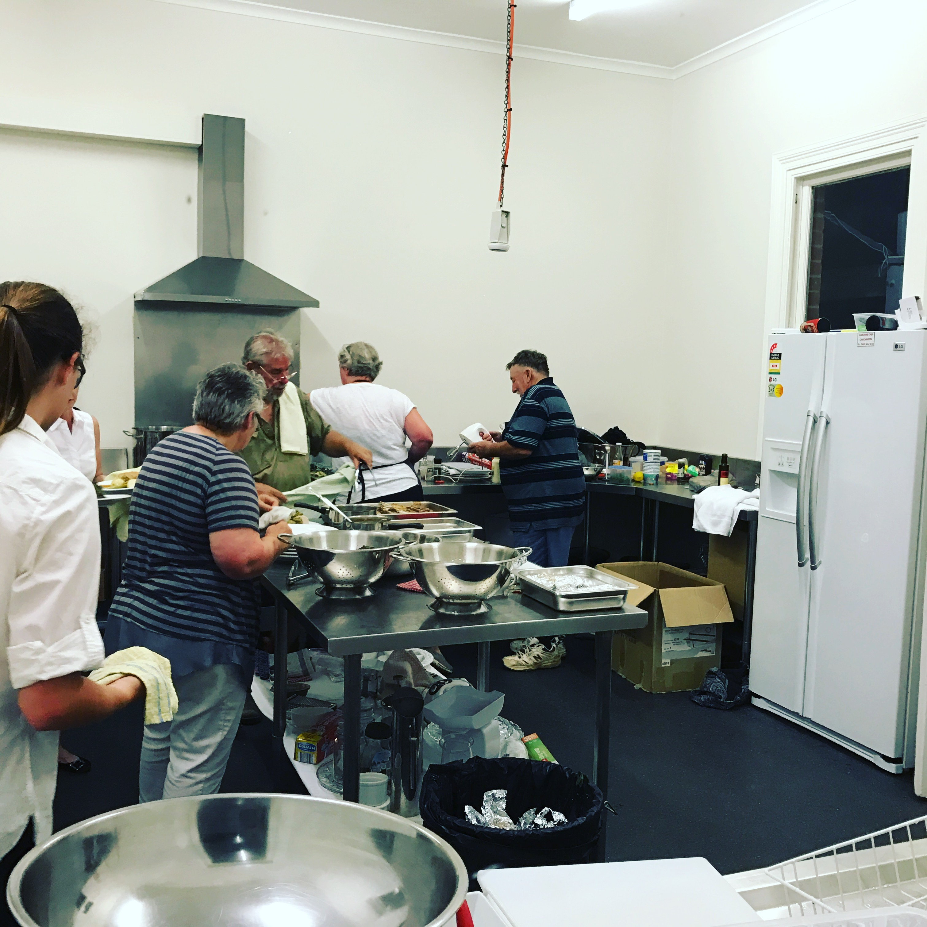 Caterers in the fully stocked commercial kitchen.